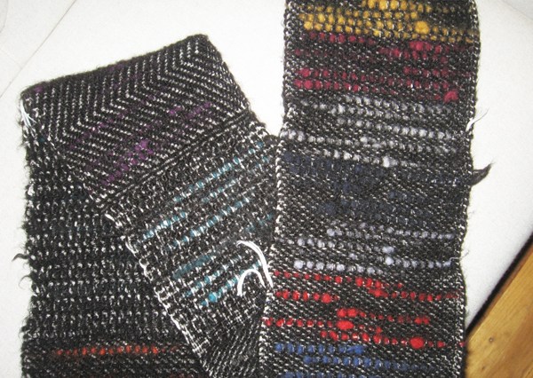 Two shuttles are used when weaving this as well as hand placing roving in a different pattern (or randomly as I prefer). I’ve done several trials of this type of design, and each time I’ve changed how to process (wash) it to felt the alpaca fiber. In the tester photos, you can see the difference between the before and after. I love the look of felting, but not when it compromises the weave. I’ve made several changes since then in how to proceed to get the look I want, those are yet to come. I still love this concept as it’s a break from doing the same pattern throughout, and I can go where my curiosity takes me.